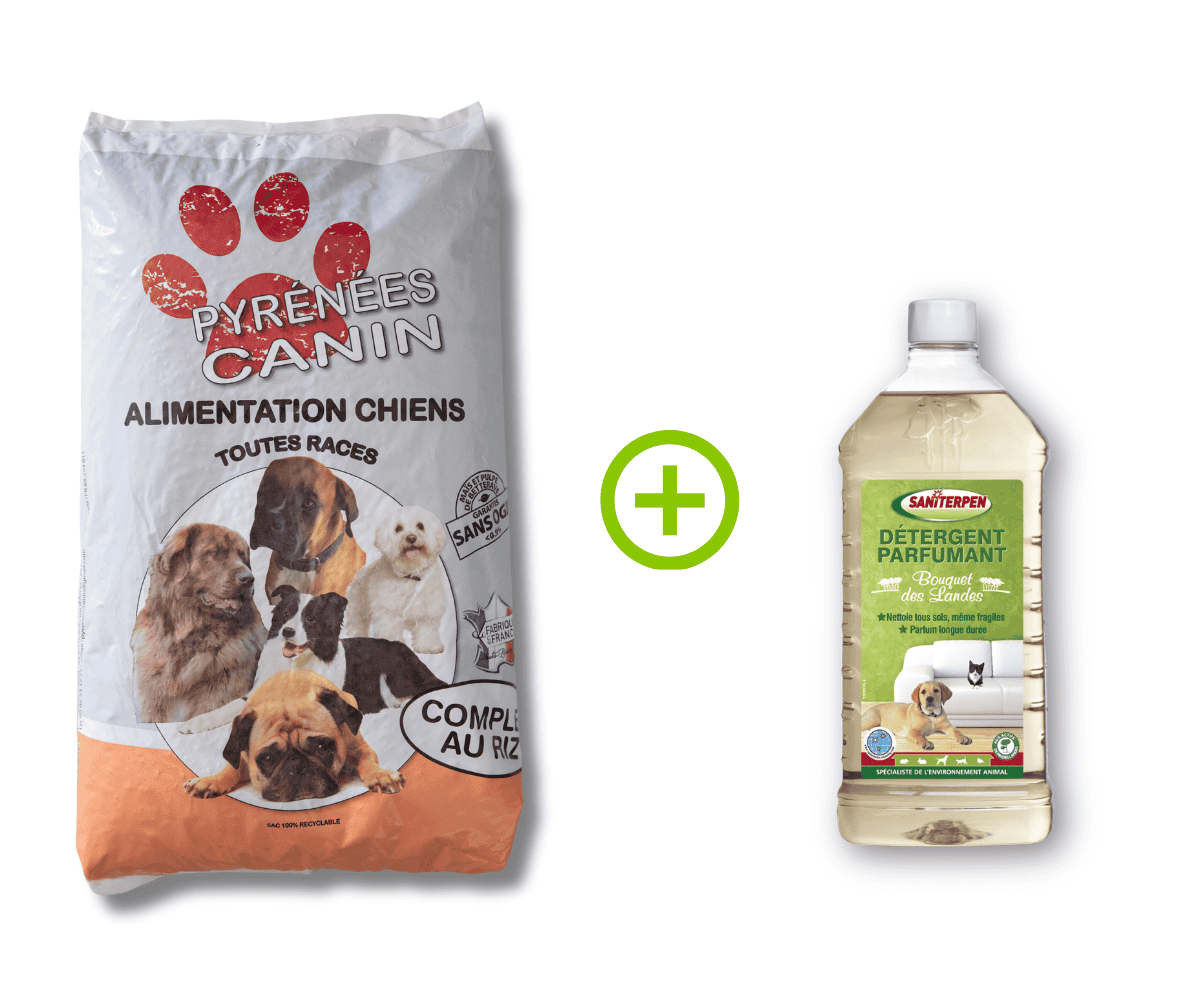 Le pack pensé pour le quotidien : 1 sac de croquettes Chien Complet au Riz 26/14 + 1 détergent Saniterpen (parfum au choix).